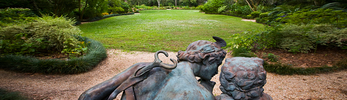 The semiformal garden areas include symmetrically designed beds, open lawns and water features. Steele Burden acquired a taste for sculpture and garden ornamentation on European tours, and he collected many pieces to adorn these gardens. The garden areas provide intimacy, with each "room" offering a different design expression.